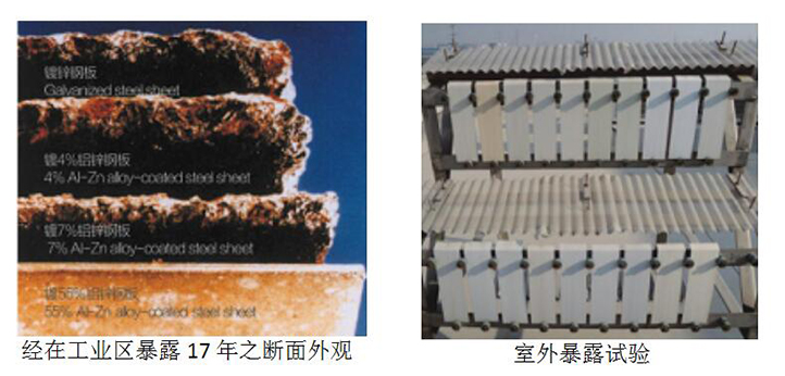 鍍55%鋁鋅鋼卷已在各種不同的大氣環(huán)境中,進行了20多年的室外曝曬試驗,證實鍍55%鋁鋅鋼板的切邊保護能力,比鍍鋅鋼板及鍍5%鋁鋅鋼板為佳。